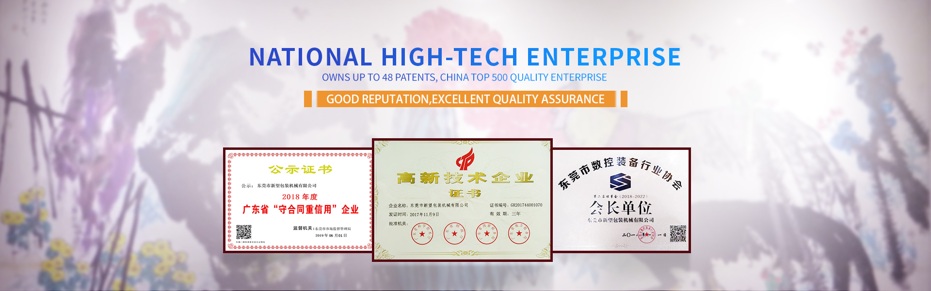 Xinwang Machinery was established in 1998 and is located in Dongping Village, Qishi Town, in the central area of the eastern industrial park in Dongguan City. It has convenient transportation, beautiful and comfortable environment, and a wide field of vision. The company has a registered capital of 20 million yuan and owns over 18000 square meters of offices, factories, and other facilities. We have passed the ISO9001:2015 international quality management system certification and hold a total of 58 national patents. It is a vice chairman unit of the Qishi Town Federation of Industry and Commerce in Dongguan, a vice chairman unit of the Qishi Town Federation of Literary and Art Circles in Dongguan, a vice chairman unit of the Dongguan Environmental Protection Packaging Industry Association, the second president unit of the Dongguan CNC Equipment Industry Association, an executive director unit of the Guangdong Packaging Technology Association, 2024 Council unit of Guangdong Adhesive Industry Association, a well-known trademark enterprise in Guangdong Province, and a national high-tech enterprise.